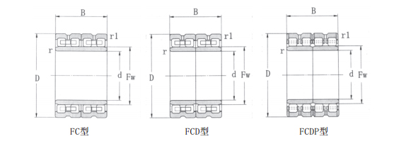 FCDP型:兩個無外擋邊的外圈,兩個內(nèi)圈、兩個外擋圈、一個中擋圈、空心滾子、柱銷 式保持架。